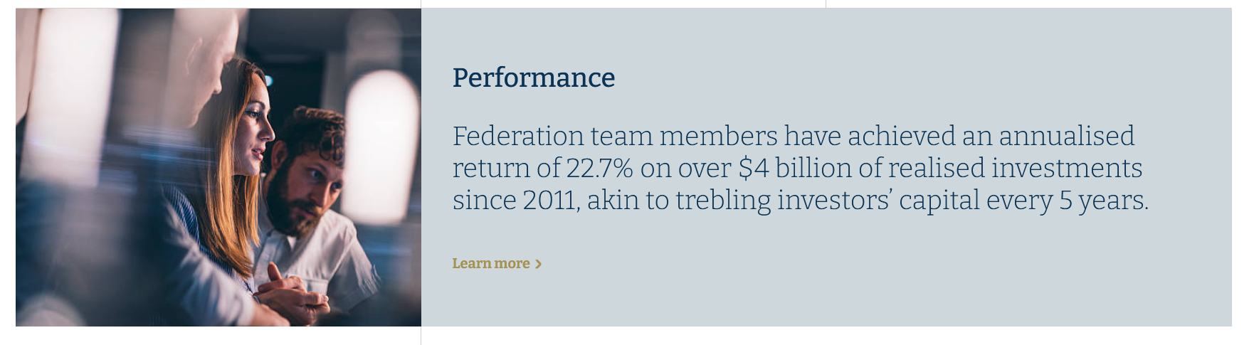 Federation trumpets that its "team members have achieved an annualised return of 22.7 per cent on over $4 billion of realised investments since 2011, akin to trebling investors' capital every five years".